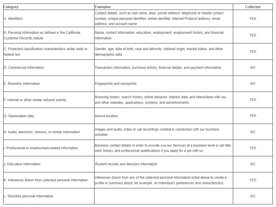 We have collected the following categories of personal information in the past twelve (12) months: